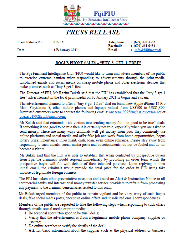 The Fiji Financial Intelligence Unit (FIU) would like to warn and advise members of the public to exercise extreme caution when responding to advertisements through the print media, unsolicited emails and social media on cheap mobile phone and other electronic devices that make promises such as “buy 3 get 1 free”.