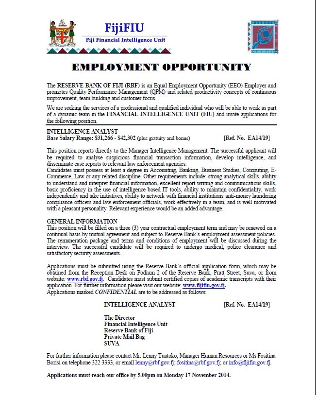 Opportunity to work as an Intelligence Analyst at the FIU, a dynamic and professional intelligence agency in Fiji. Candidates must at least possess a relevant degree, have strong analytical skills, ability to understand and interpret financial information, excellent report writing and communications skills, basic proficiency in the use of intelligence based IT tools, ability to maintain confidentiality, work independently and take initiatives, ability to network with financial institutions' anti-money laundering compliance officers and law enforcement officials, work effectively in a team, and is well motivated with a pleasant personality. Relevant experience would be an added advantage. Application close on 17 November 2014.