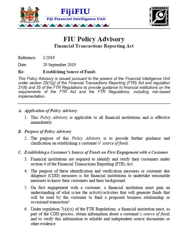 FIU Policy Advisory 1/2019 - Establishing Source of Funds