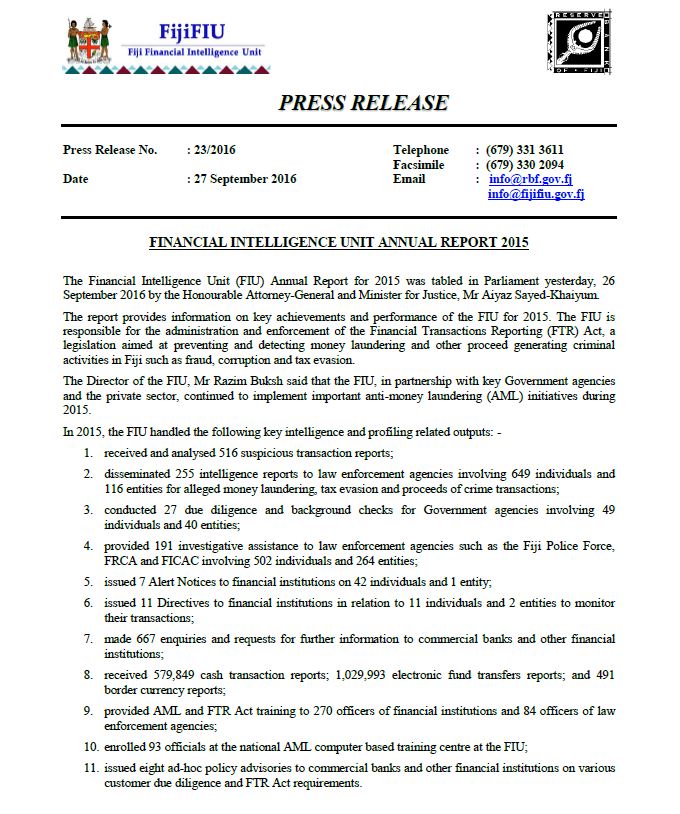 The Financial Intelligence Unit (FIU) Annual Report for 2015 was tabled in Parliament yesterday, 26 September 2016 by the Honourable Attorney-General and Minister for Justice, Mr Aiyaz Sayed-Khaiyum.
