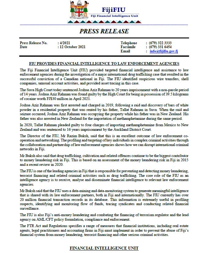The Fiji Financial Intelligence Unit (FIU) provided targeted financial intelligence and assistance to law enforcement agencies during the investigation of a major international drug trafficking case that resulted in the successful conviction of a Canadian national in Fiji. The FIU identified suspicious wire transfers, shell companies, unusual account activities, and provided asset tracing in this case.
