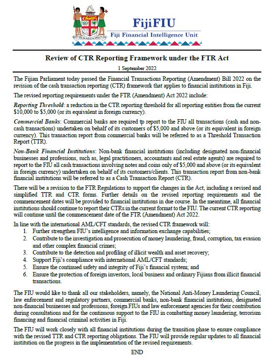 The Fijian Parliament today passed the Financial Transactions Reporting (Amendment) Bill 2022 on the revision of the cash transaction reporting (CTR) framework that applies to financial institutions in Fiji.