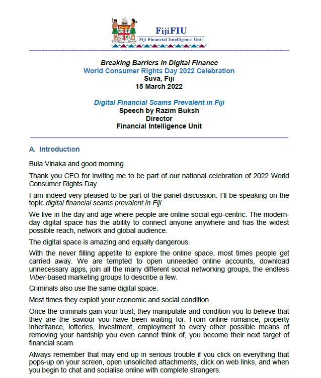 Director FIU's speech at the national celebration of 2022 World Consumer Day which was hosted by Consumer Council of Fiji on 15 March 2022.
