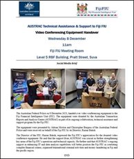 The Director of the FIU, Razim Buksh, expressed the Fiji FIU’s appreciation for the donated video conference equipment. He said that the support from AUSTRAC was crucial in further strengthening key areas of the Fiji FIU’s operations and technical capacity. He further said that AUSTRAC’s ongoing support in enhancing IT and data analysis capabilities will better position the Fiji FIU in combating complex financial crimes, organised transnational criminal activities and money laundering in Fiji and the pacific region.