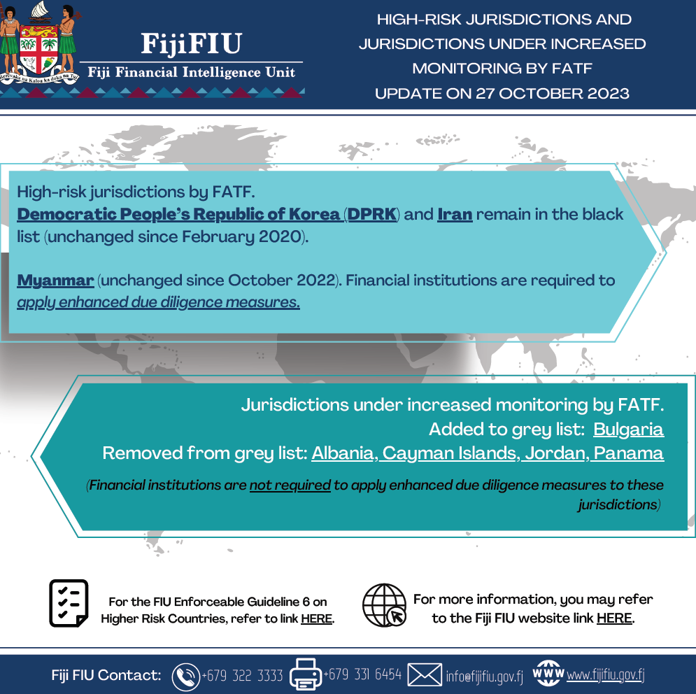 October 2023 update from FATF Public Statement on High-risk jurisdictions and Jurisdictions under increased monitoring by FATF.
