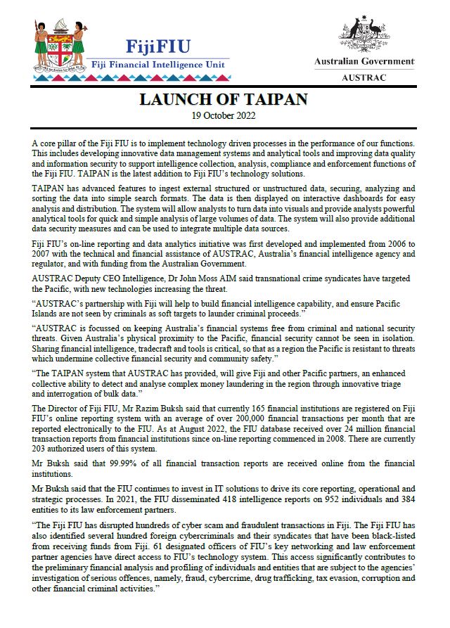 FIJI FIU Media Release - Launch Of TAIPAN