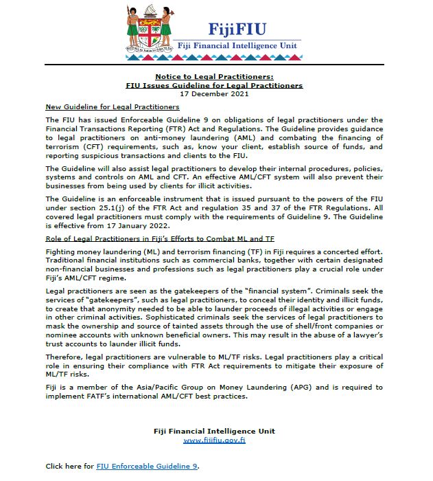 The FIU has issued Enforceable Guideline 9 on obligations of legal practitioners under the Financial Transactions Reporting (FTR) Act and Regulations. The Guideline provides guidance to legal practitioners on anti-money laundering (AML) and combating the financing of terrorism (CFT) requirements, such as, know your client, establish source of funds, and reporting suspicious transactions and clients to the FIU.