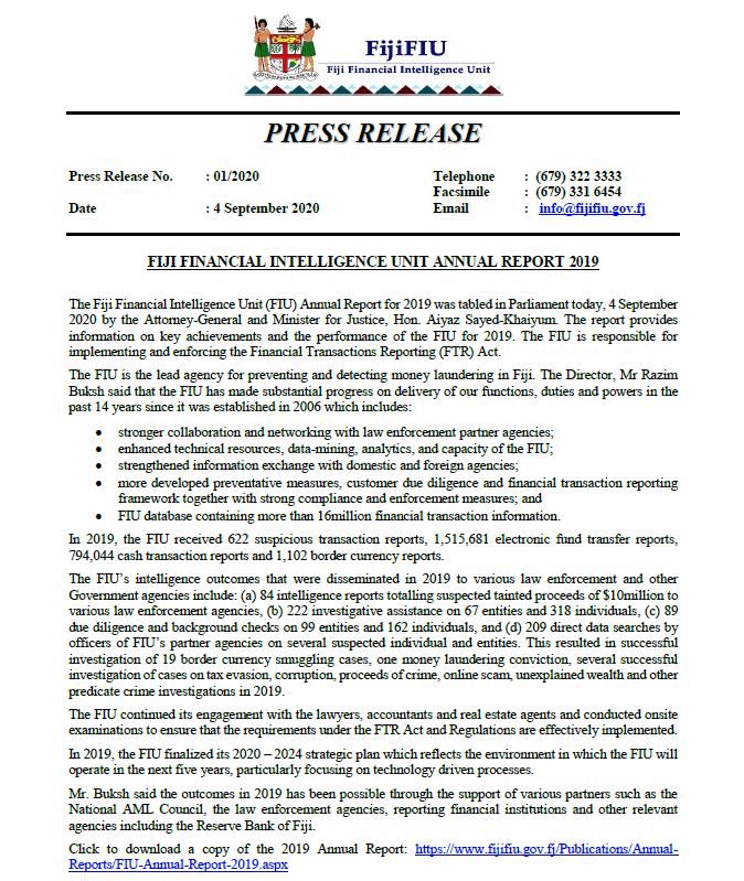 The Fiji Financial Intelligence Unit (FIU) Annual Report for 2019 was tabled in Parliament today, 4 September 2020 by the Attorney-General and Minister for Justice, Hon. Aiyaz Sayed-Khaiyum. The report provides information on key achievements and the performance of the FIU for 2019. The FIU is responsible for implementing and enforcing the Financial Transactions Reporting (FTR) Act.