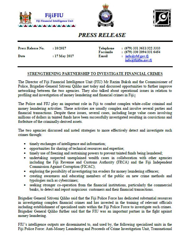 The Director of Fiji Financial Intelligence Unit (FIU) Mr Razim Buksh and the Commissioner of Police, Brigadier-General Sitiveni Qiliho met today and discussed opportunities to further improve networking between the two agencies. They also talked about operational issues in relation to profiling and investigation of money laundering and financial crimes in Fiji.
