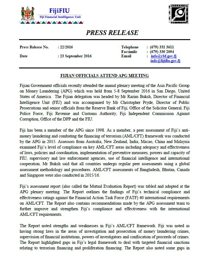 Fijian Government officials recently attended the annual plenary meeting of the Asia Pacific Group on Money Laundering (APG) which was held from 5-8 September 2016 in San Diego, United States of America. The Fijian delegation was headed by Mr Razim Buksh, Director of Financial Intelligence Unit (FIU) and was accompanied by Mr Christopher Pryde, Director of Public Prosecutions and senior officials from the Reserve Bank of Fiji, Office of the Solicitor General, Fiji Police Force, Fiji Revenue and Customs Authority, Fiji Independent Commission Against Corruption, Office of the DPP and the FIU.