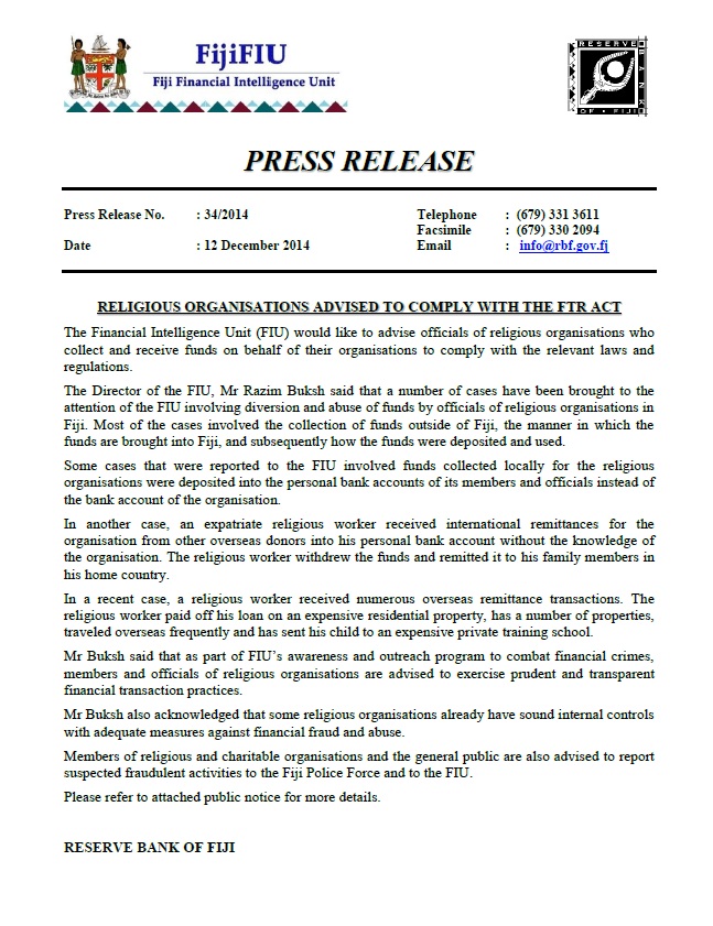 Press Release 34/2014:Religious Organisations Advised To Comply with the FTR ACT